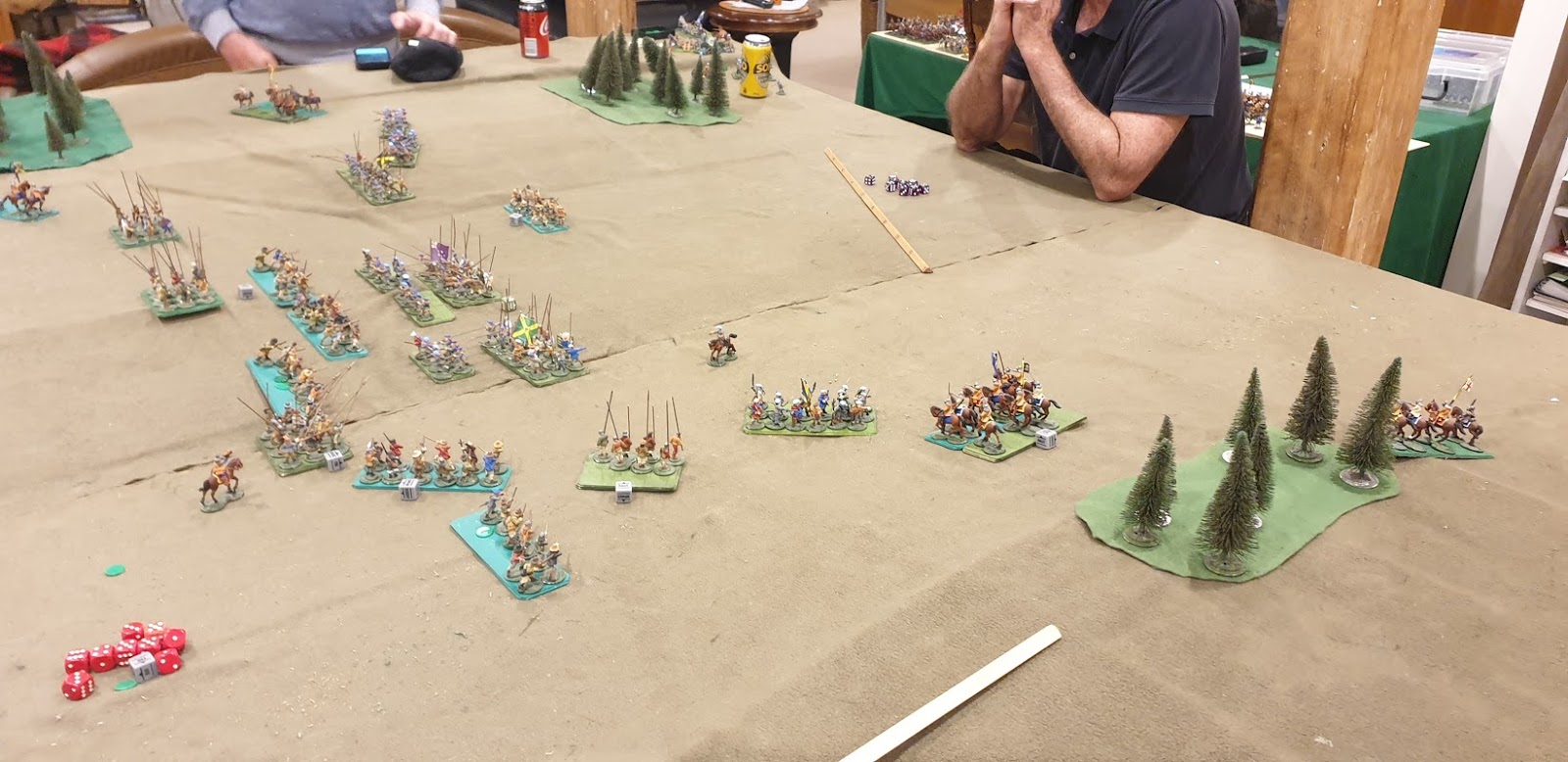 The English are on the left. In the first turn they held back their foot & their extra heavy cavalry on their left & pushed forward on their right. The Scots made a general advance, a bit disrupted by a command failure in the centre. Half their left flank cavalry have pulled back behind the wood on the right, other half is on the flank of the highlanders.